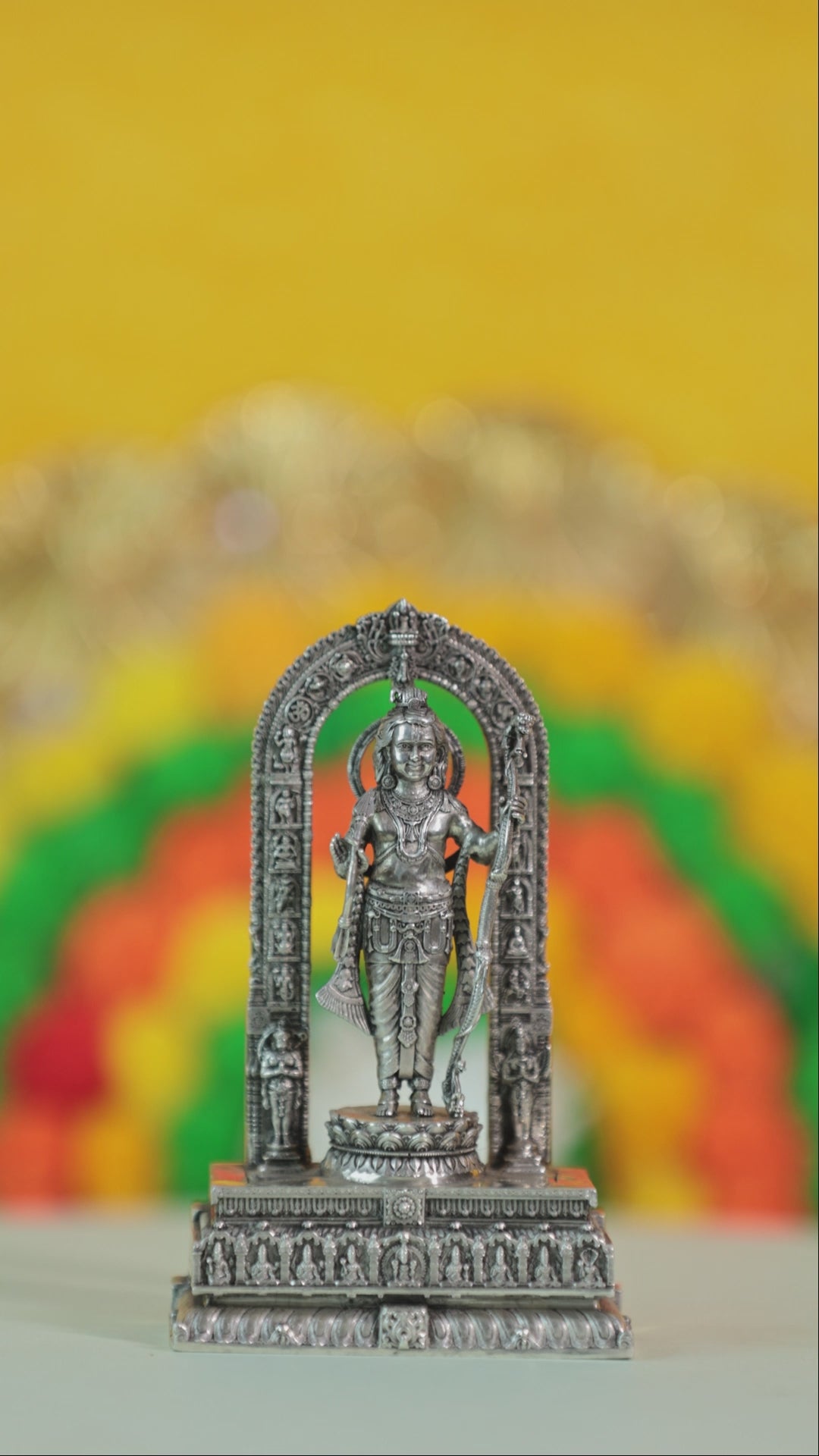 This exquisite image features a beautifully crafted, silver-plated replica of the revered Ram Lalla idol, inspired by the sacred deity of Ayodhya. The statue depicts Lord Ram in a standing posture, holding his iconic bow and arrow, enveloped within an intricately designed arched frame. Set against a vibrant background adorned with colorful floral decorations, the idol radiates a divine aura, embodying purity, innocence, and spiritual significance. This miniature masterpiece serves as a symbol of devotion and a stunning decorative piece, perfect for home altars, puja rooms, or as a cherished gift.
